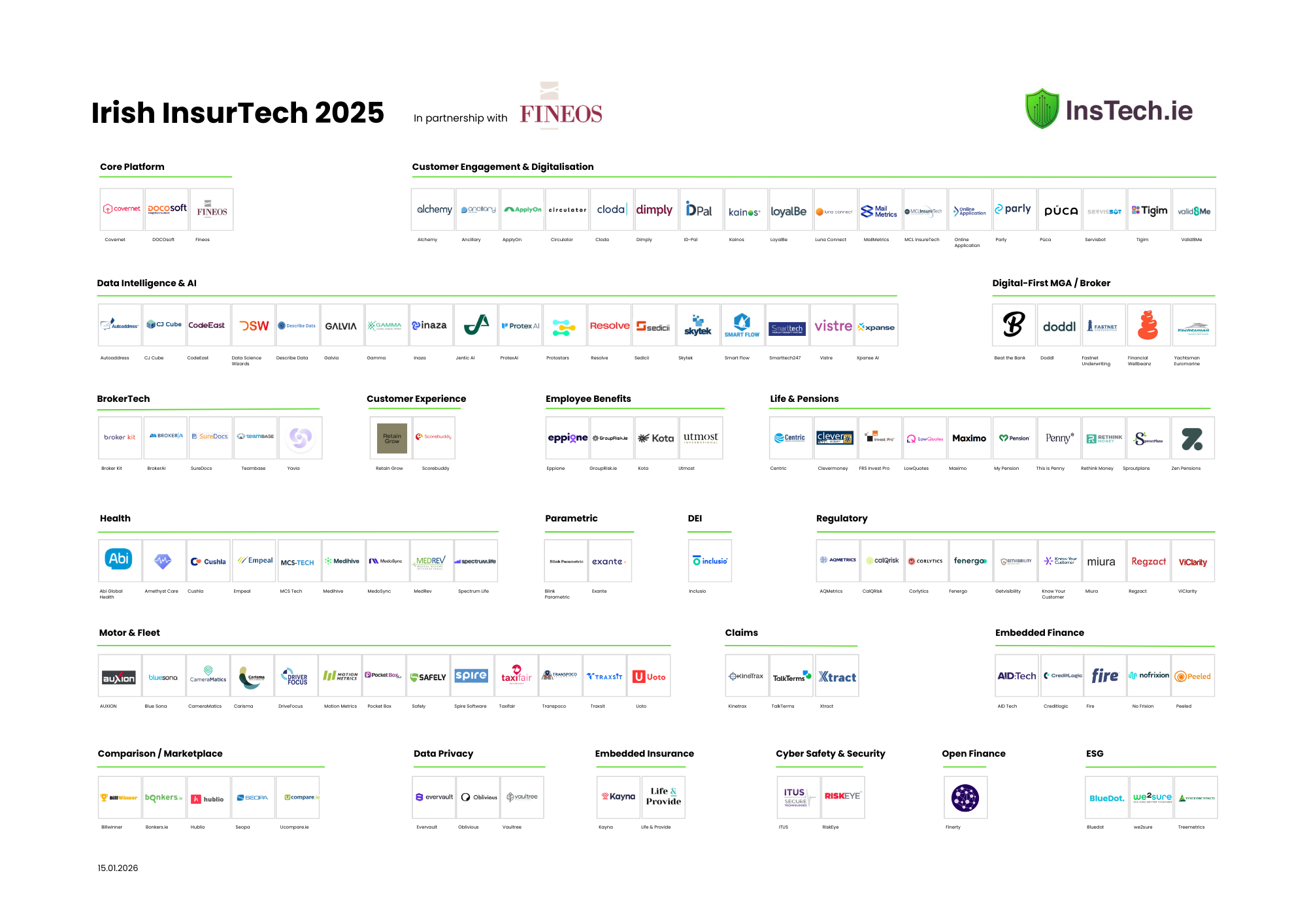 InsTech.ie has compiled a map and directory of 114 Irish Insurtechs, from startups to established and scaling companies. The map and directory is updated regularly to add any newly established insurtechs. If you think your company should appear on the map, get in touch with us.